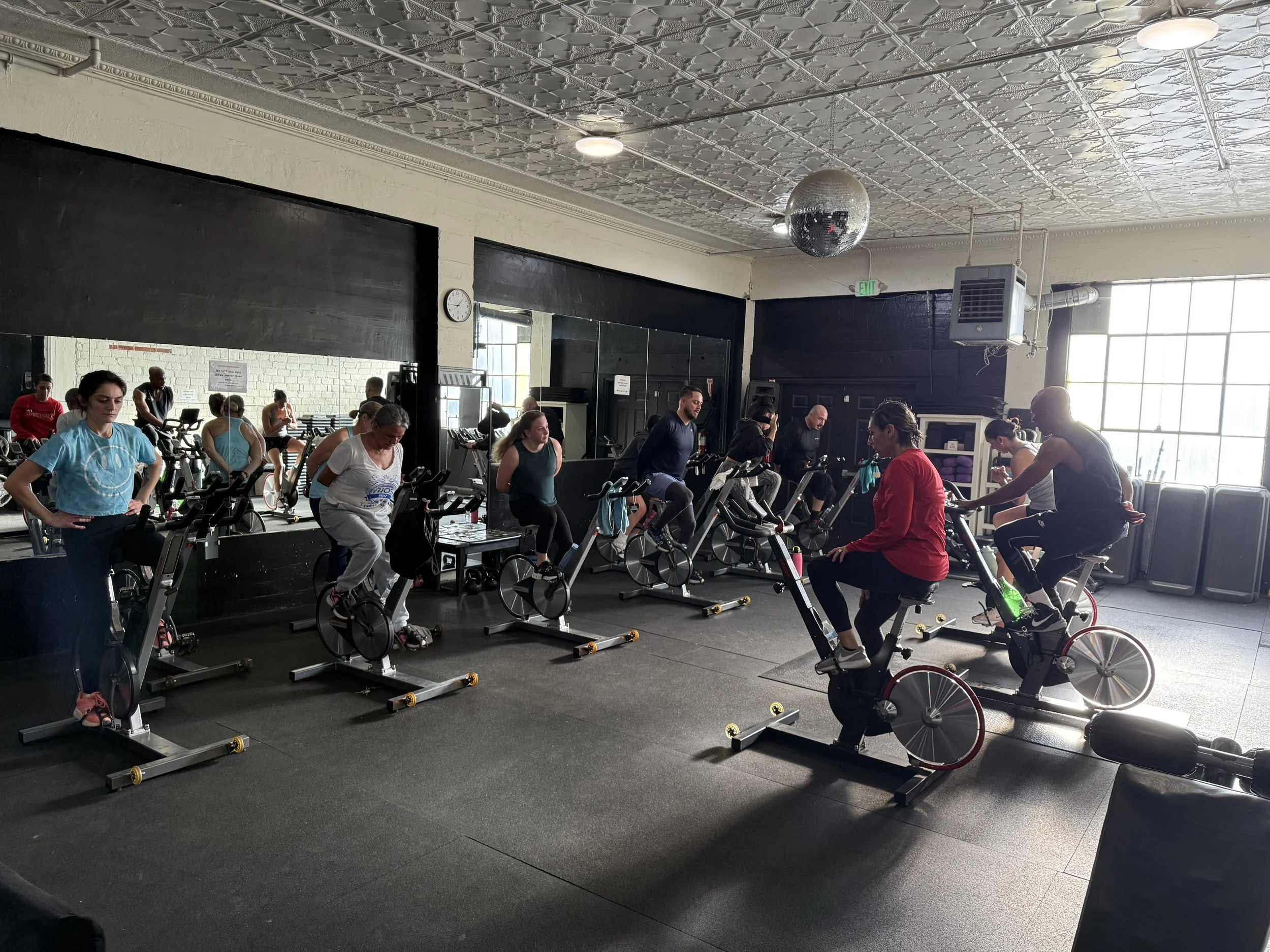 Spin Bike: An aerobics type workout on stationary bikes via high intensity interval training.
